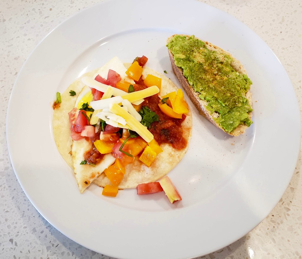 Dice any of the extra toppings you chose, and set aside. Warm up your tortillas, and prepare an over-easy egg. Place the egg on the tortilla, and then top with the cheese, salsa, and remaining toppings.