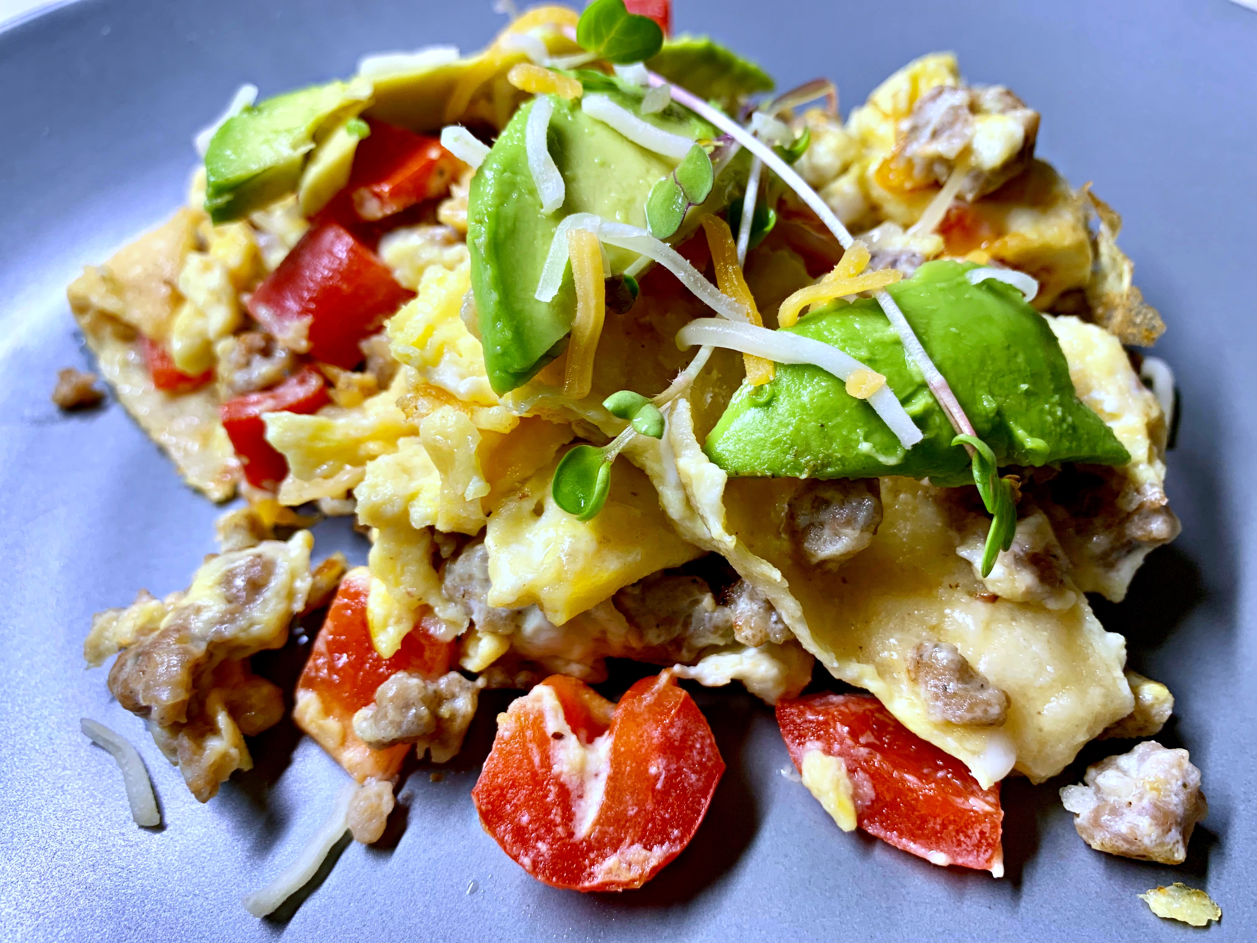 - Once the scramble is finished cooking, transfer to a plate and top with more cheese, avocado slices, and some sprouts.