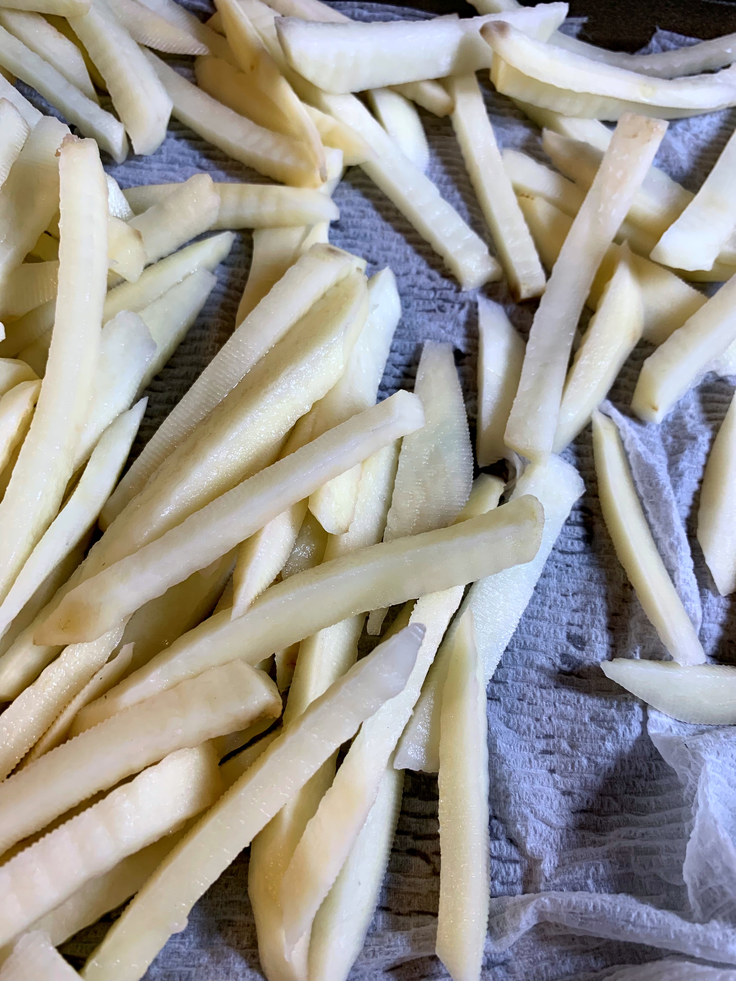 - Next is cutting. I like to have thinner fries, so here’s how I cut mine: slice your potato in half lengthwise. Place both halves cut side down so they have a flat surface. Slice lengthwise into thin slices all along the potato. Take those slices, and cut into smaller, fry-like shapes and set aside in the large bowl. Repeat for all potatoes.