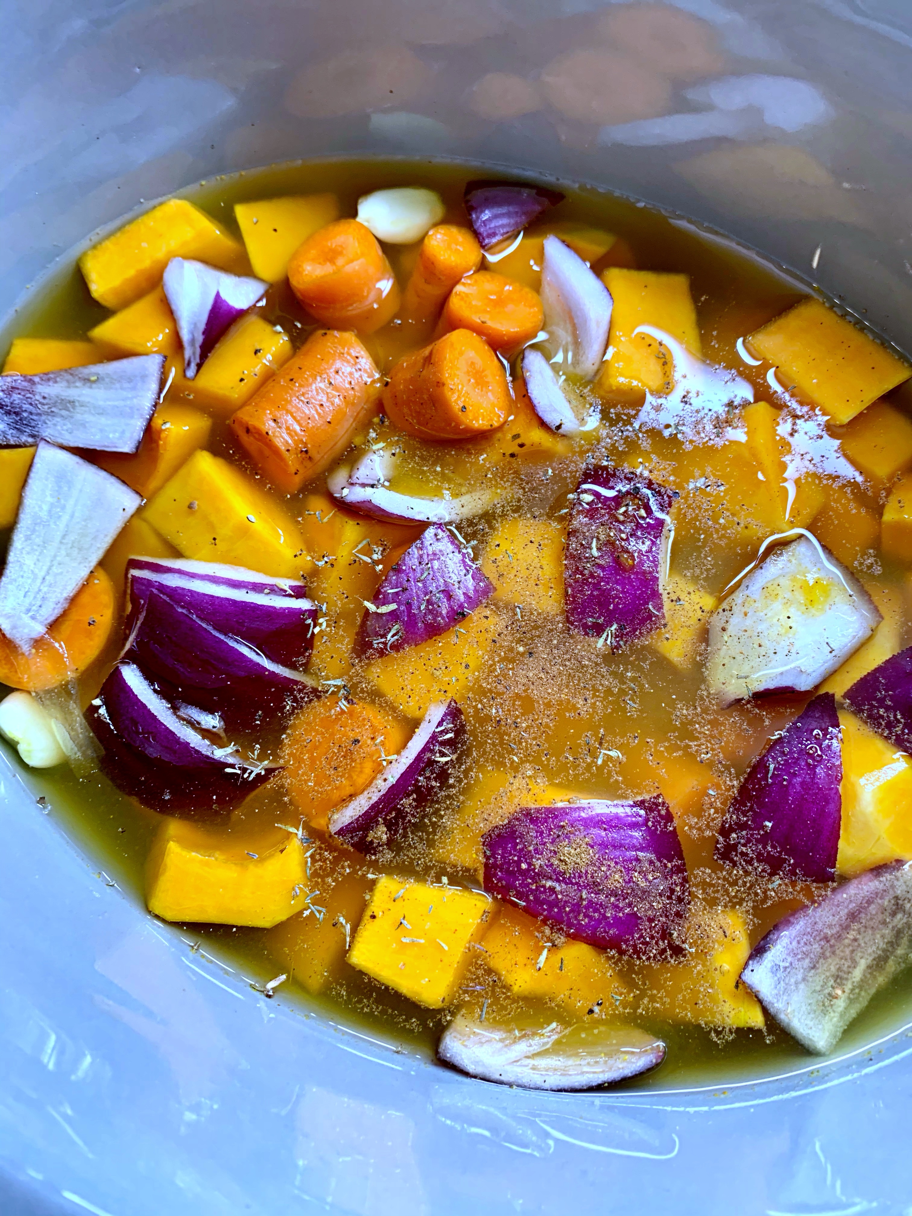 In your crockpot, add the pumpkin stock, water, carrots, butternut squash, onion and garlic. Add a few dashes of the spices, and then cook on high for 5 hours. Feel free to stir every hour or so.