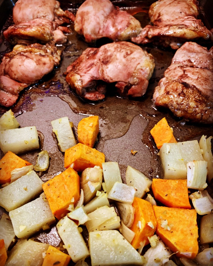 Let’s start the year off with a sheet pan dinner. I recently tried them for the first time, and quickly became obsessed. They’re so easy – cook and clean up! This is a honey balsamic chicken with veggies sheet pan dinner, and serves 2-4.