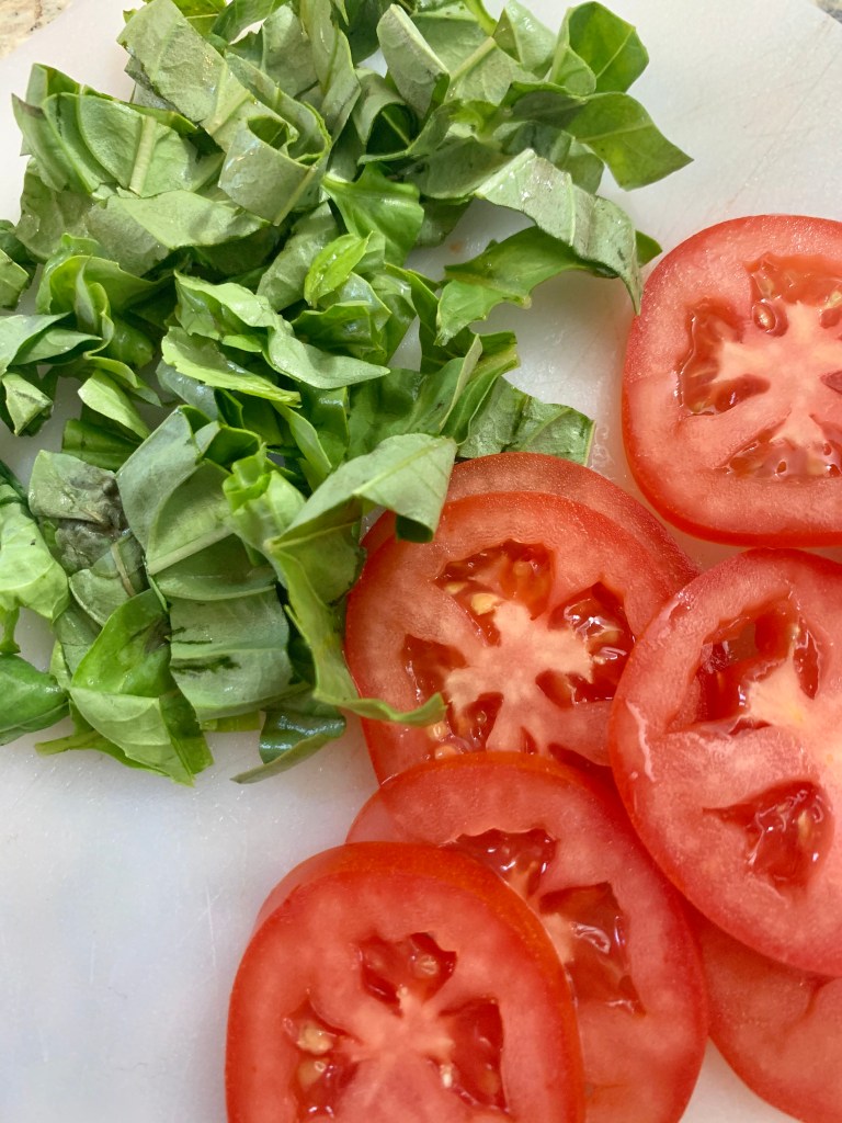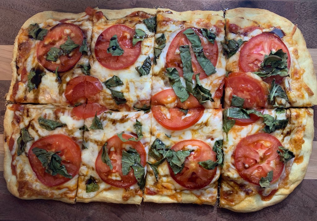 - Finish baking dough with everything on it except the balsamic and sea salt. Sauce, cheese, tomato, and then the basil.