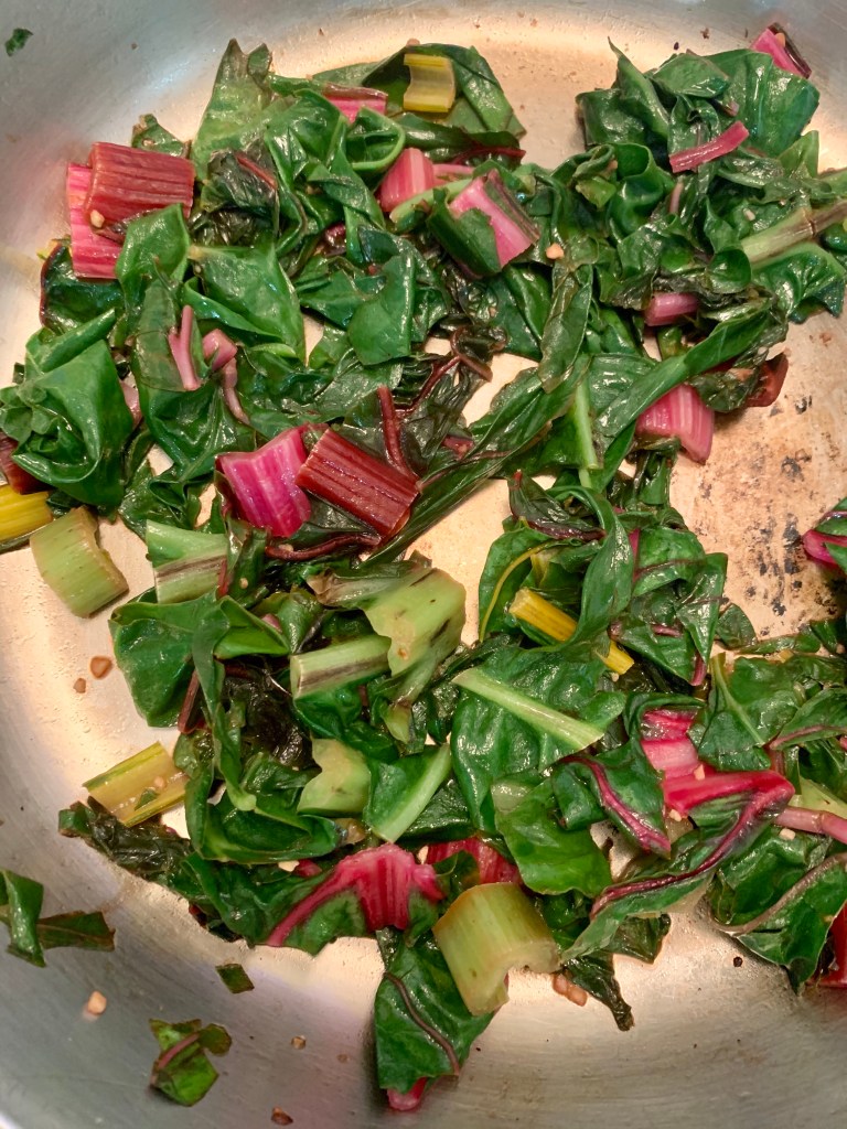 - Add garlic to the pan, and cook for about a minute. Add the rainbow chard to the pan and cook together, stirring here and there.