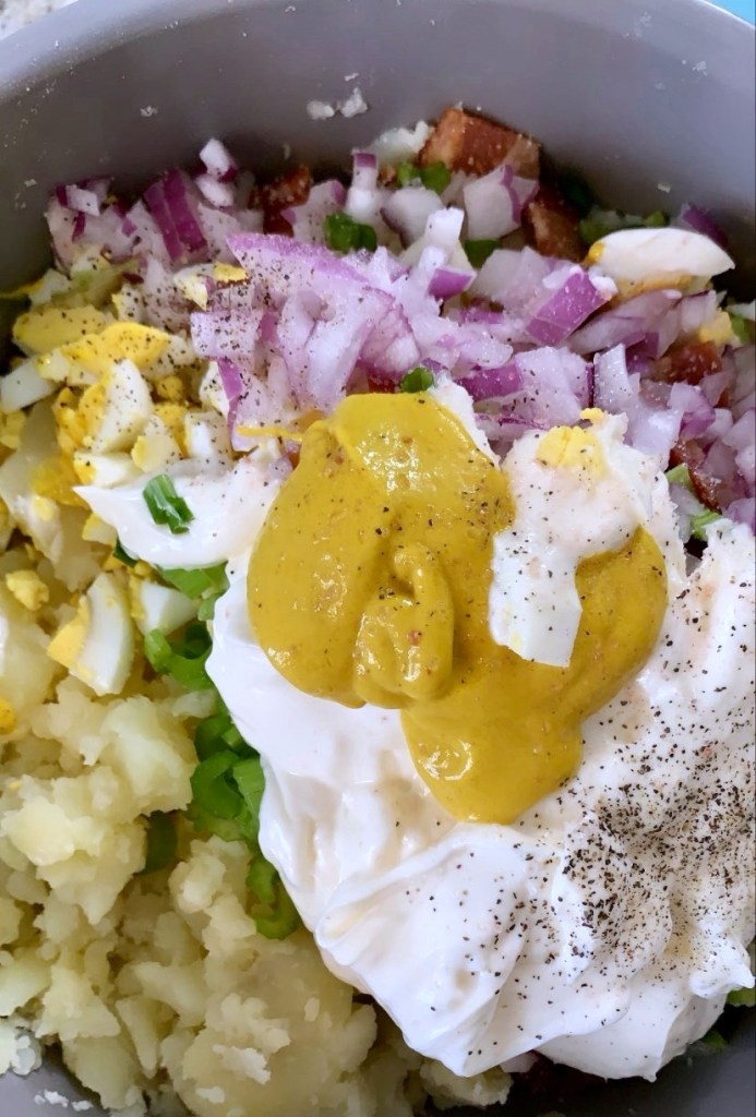 I’m including amounts with the ingredients like normal, but feel free to alter the amount of whichever ingredient(s) you would like. I know everyone has different preferences when it comes to red onions, mayonnaise, etc. so make it your own if need be! You can also omit the bacon and have a vegetarian potato salad.